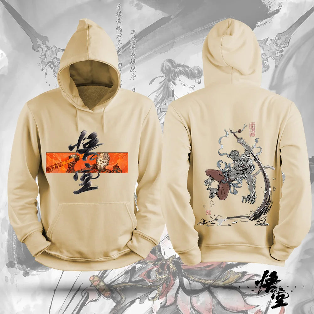 Step into the world of Black Myth: Wukong with this stunning beige hoodie. Featuring captivating artwork on both the front and back, this hoodie showcases Wukong in all his glory. The beige color provides a unique and stylish backdrop to the dynamic designs, making this hoodie a standout addition to your wardrobe.