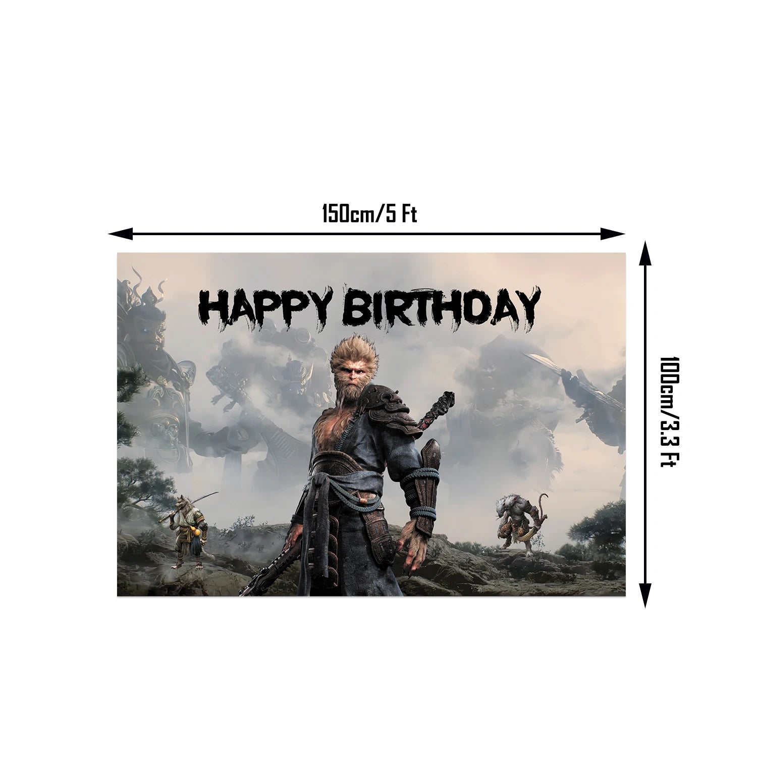 Crafted from durable, lightweight polyester fabric, this backdrop measures 150 × 100 cm (5 × 3.3 ft), making it perfect for party setups, cake table decorations, or photo booths. The high-resolution print ensures sharp details, vibrant colors, and a cinematic effect, bringing the world of Black Myth: Wukong to life at your celebration.