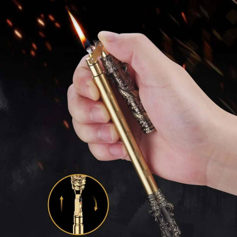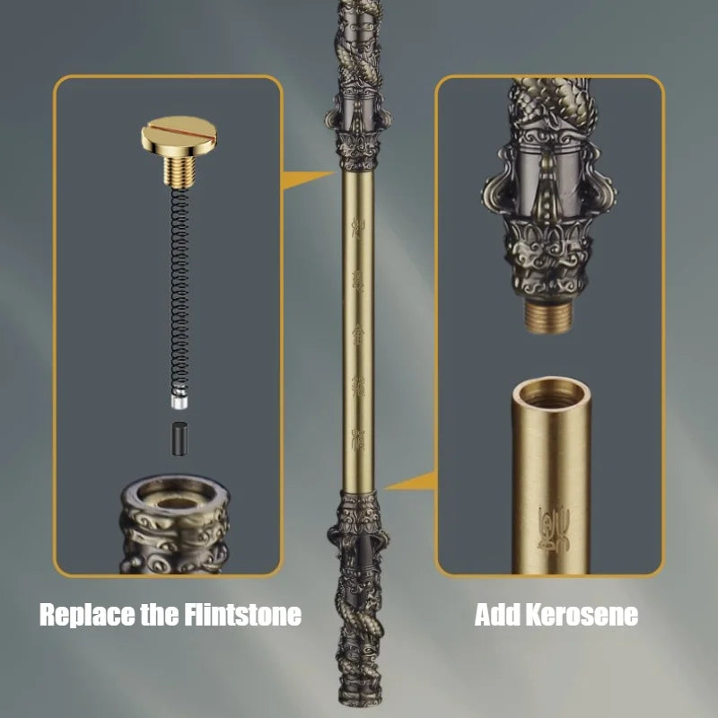 Crafted with precision, this lighter features a striking bronze-tone metallic finish, intricate carvings, and a robust coal oil ignition system. Its portable and foldable design ensures easy use and transport, while the solid build guarantees durability. Whether you're lighting a cigar or displaying it as part of your collection, this piece is made to impress.