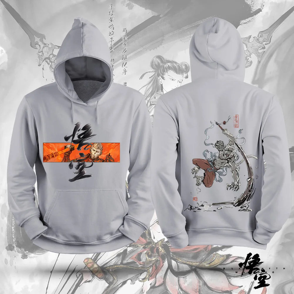 Unleash your inner warrior with this gray hoodie, featuring iconic artwork from Black Myth: Wukong. The front design captures Wukong in action, while the back features a powerful image of the legendary hero. The classic gray color complements the striking artwork, making this hoodie both stylish and a perfect addition to your wardrobe.