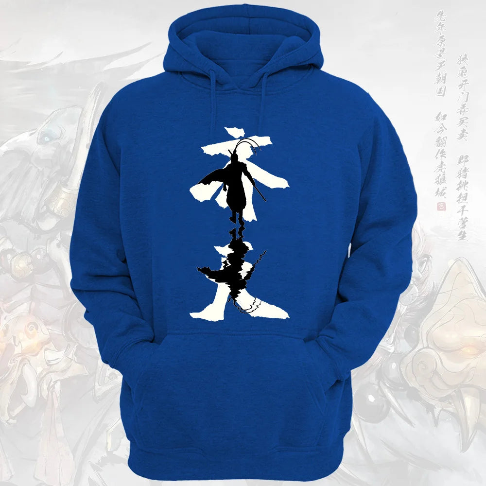 Embrace the mystical power of Sun Wukong with this blue Black Myth Wukong hoodie, inspired by the epic journey of the Monkey King. Featuring a striking silhouette design, this hoodie is a must-have for fans of the game and Chinese mythology.