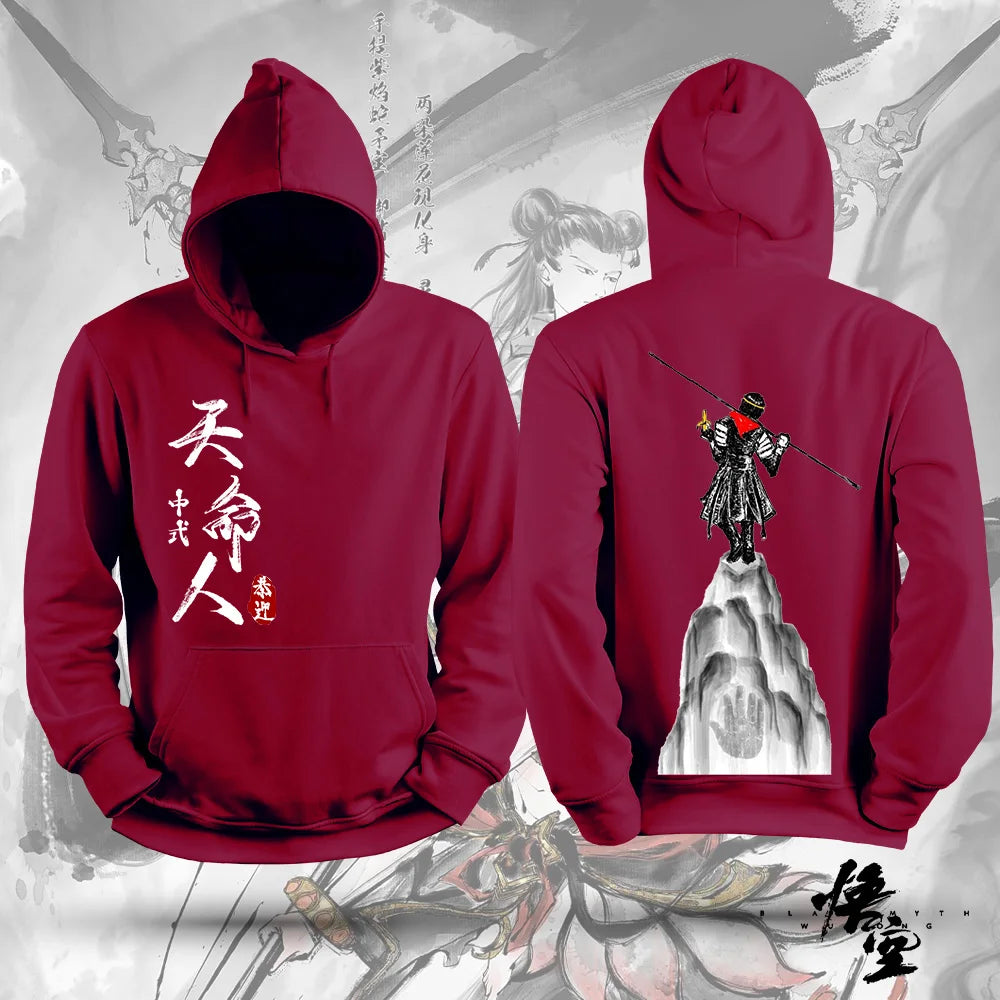 Step into the legend of Sun Wukong with this stunning burgundy Black Myth Wukong hoodie, featuring a bold front Chinese calligraphy print and an intricate back illustration of the Monkey King standing atop a mountain with his legendary staff.