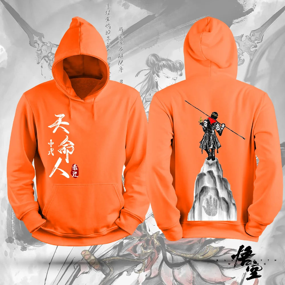 Unleash the power of Sun Wukong with this striking orange Black Myth Wukong hoodie, featuring authentic Chinese calligraphy on the front and an epic back design of the Monkey King standing on a mountain wielding his legendary staff.