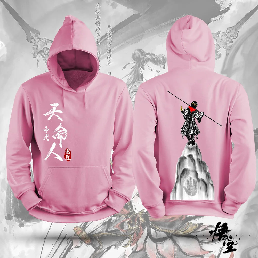 Embrace the legend of Black Myth Wukong with this chic pink hoodie, featuring traditional Chinese calligraphy on the front and a striking image of Sun Wukong standing on a mountain wielding his mystical staff on the back.