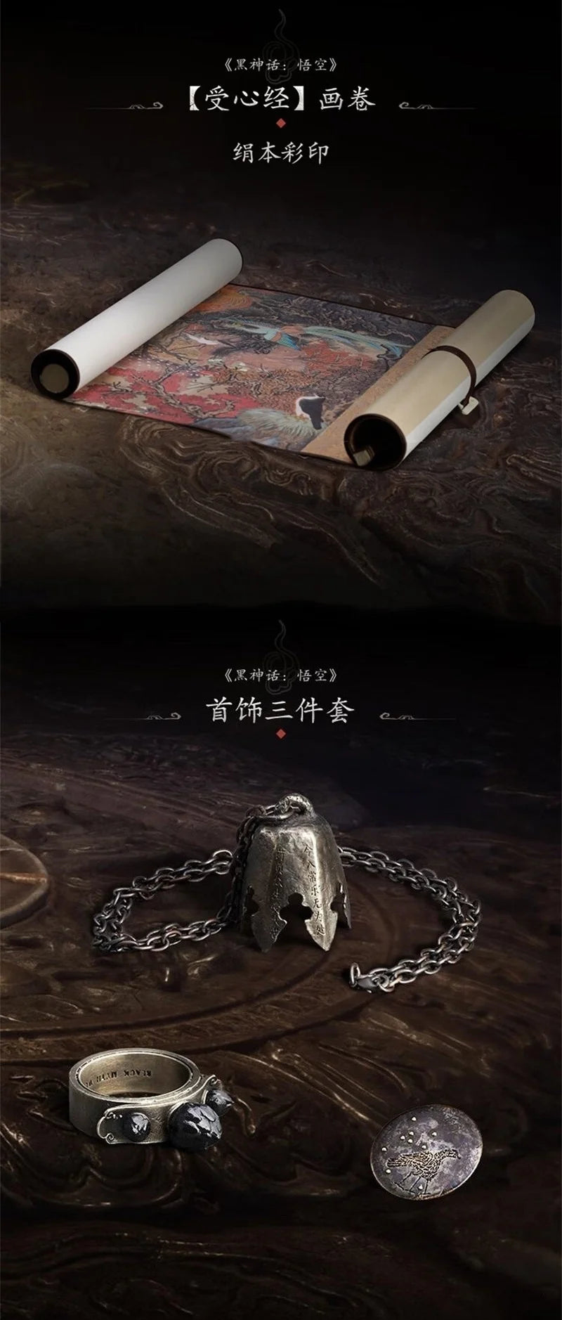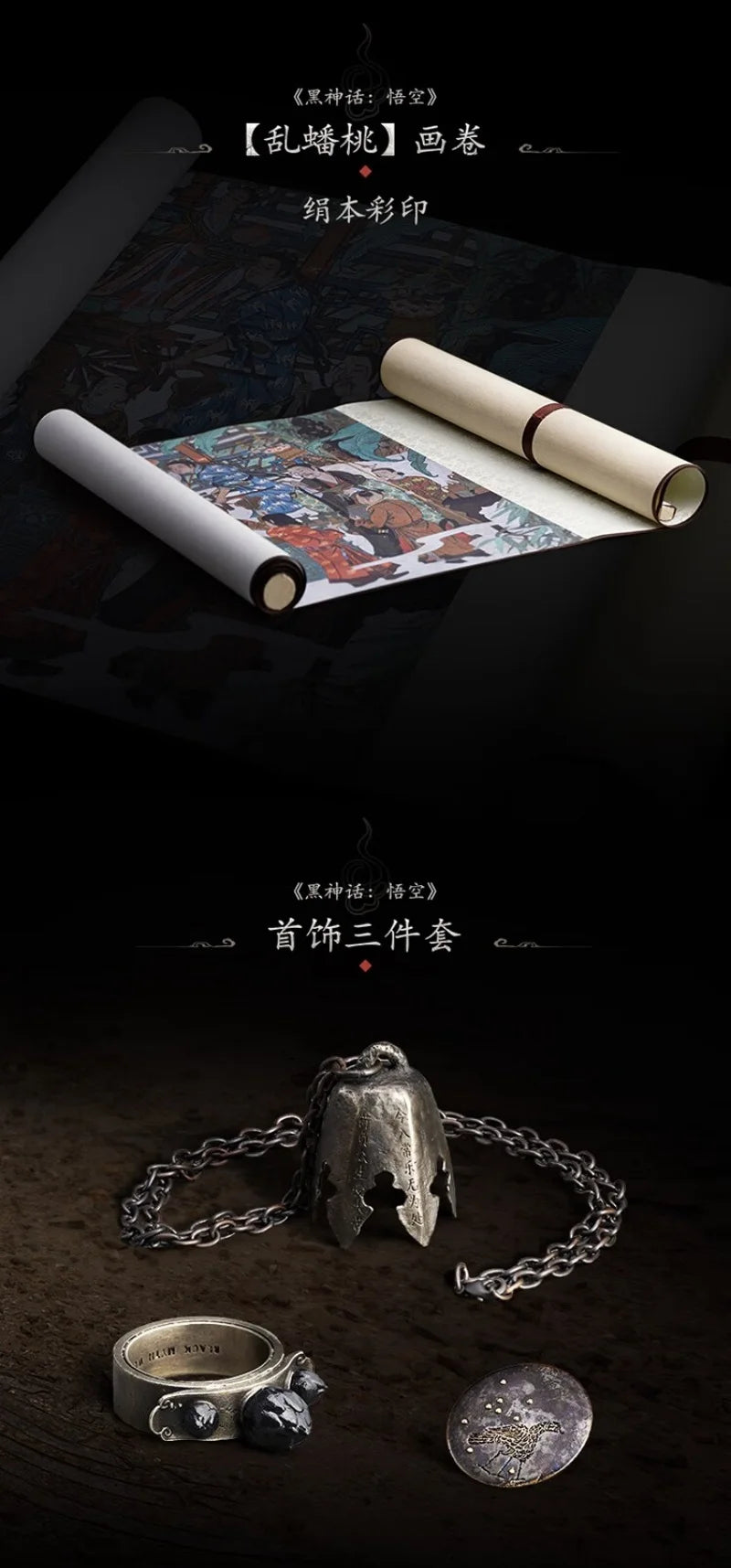 This collector’s set includes a 1:1 scale brass-plated headband, a symbolic piece representing the mystical power that controls the Monkey King. The box also features hand-painted scroll artwork, a traditional warrior necklace, an engraved metal ring, a golden emblem, and collectible postcards—all meticulously designed to reflect the game’s cultural depth and visual style.