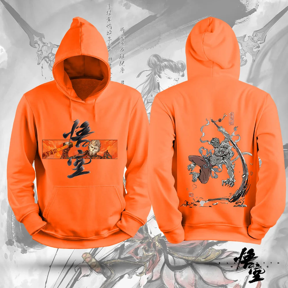 Stand out with this bold orange hoodie featuring iconic artwork from Black Myth: Wukong. The front design showcases a striking illustration of Wukong, while the back features a full-body action shot of the warrior in battle, capturing his strength and bravery. This hoodie is the perfect way to express your admiration for this legendary hero.