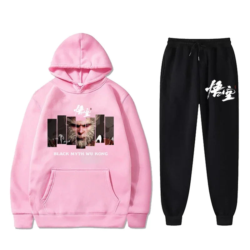 Whether you're gaming at home or hanging out with friends, this hoodie and pants set is the perfect choice. The soft pink hoodie adds a pop of color, while the black pants complete the look with sleek elegance. This Black Myth: Wukong set is great for all-day comfort and fashionable versatility.