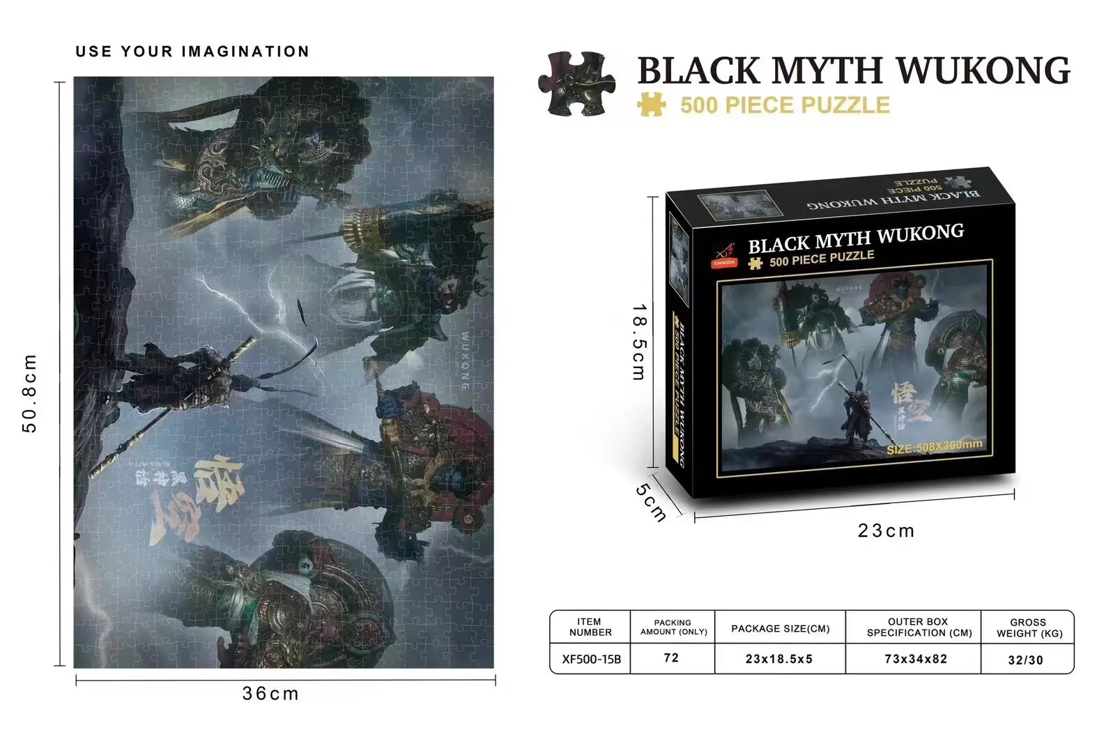 Crafted with high-quality materials, this 500-piece puzzle offers precise cuts, durability, and a satisfying assembly experience. Once completed, the large-format image delivers impressive visual impact, making it suitable for framing or display as part of your merchandising Black Myth Wukong collection.
