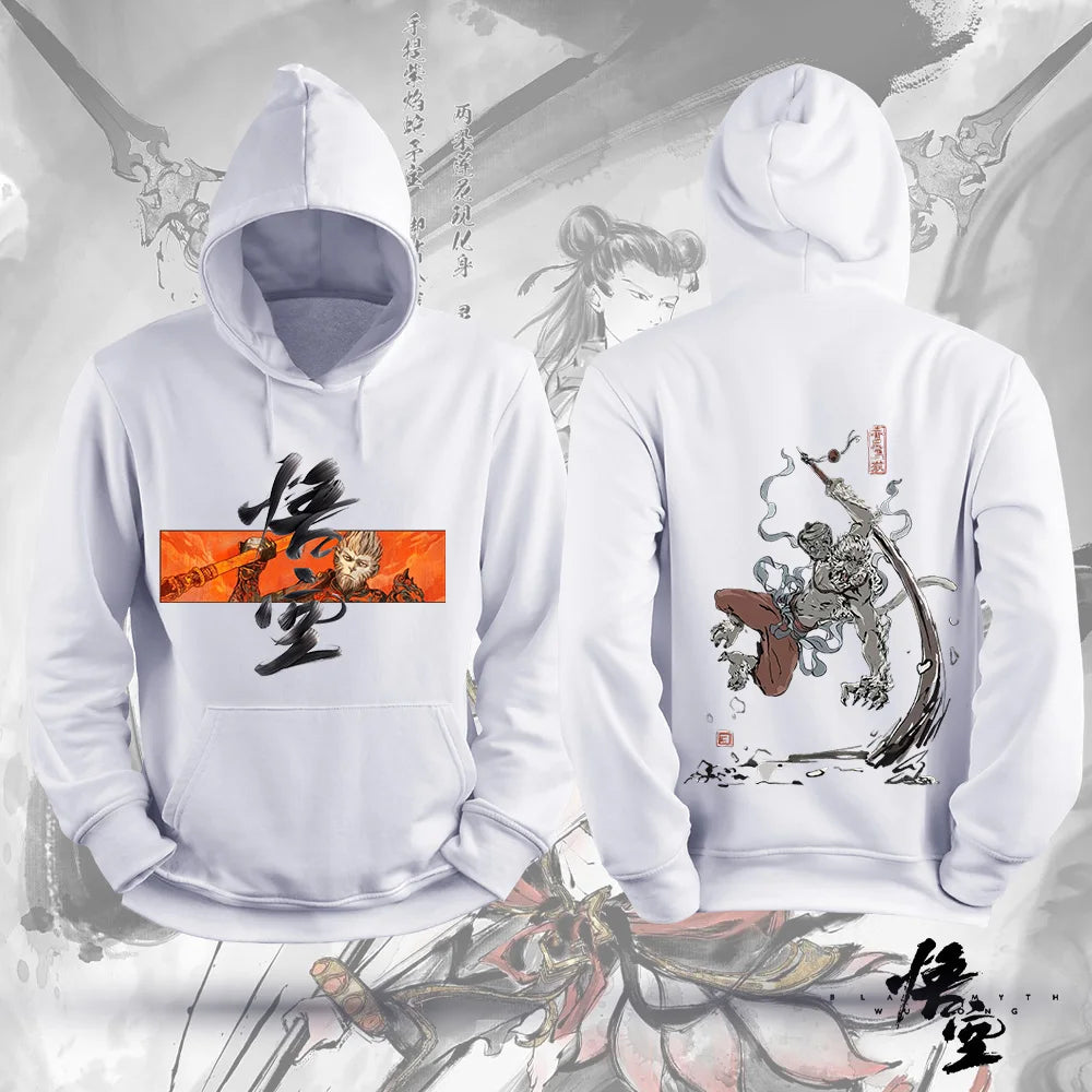 Step up your fashion game with this white hoodie, designed to showcase the powerful world of Black Myth: Wukong. The front features an eye-catching image of Wukong in action, while the back highlights his fierce, legendary presence. The clean white design complements the striking artwork, making this hoodie an essential for any fan of the game.