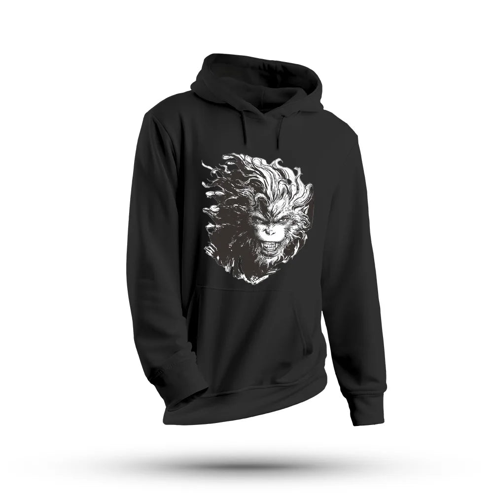 Step into the world of Black Myth: Wukong with this Fierce Wukong Black Hoodie. Designed for fans who embrace the spirit of the legendary Monkey King, this hoodie features an eye-catching black and white Wukong design, perfectly contrasted against a sleek black background.