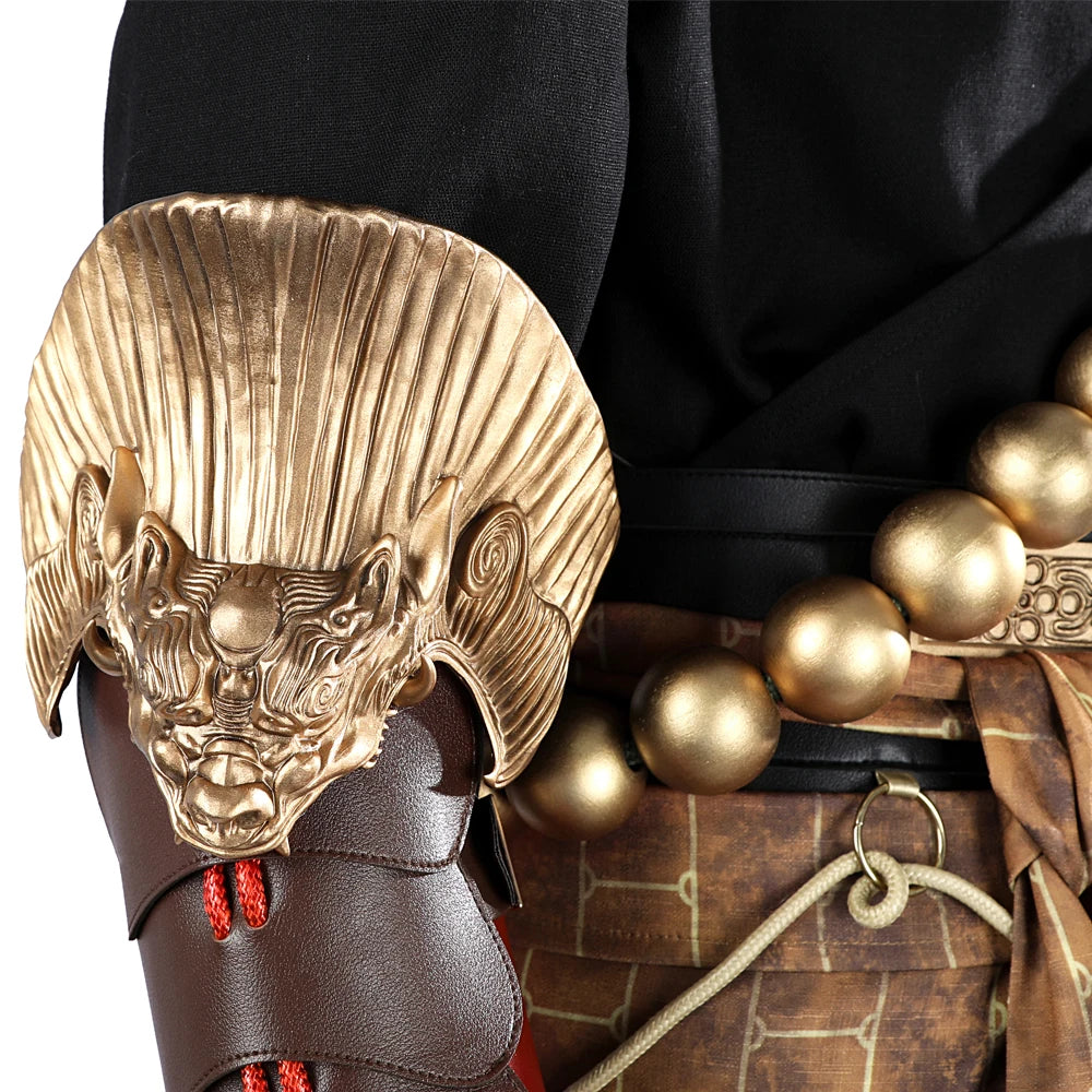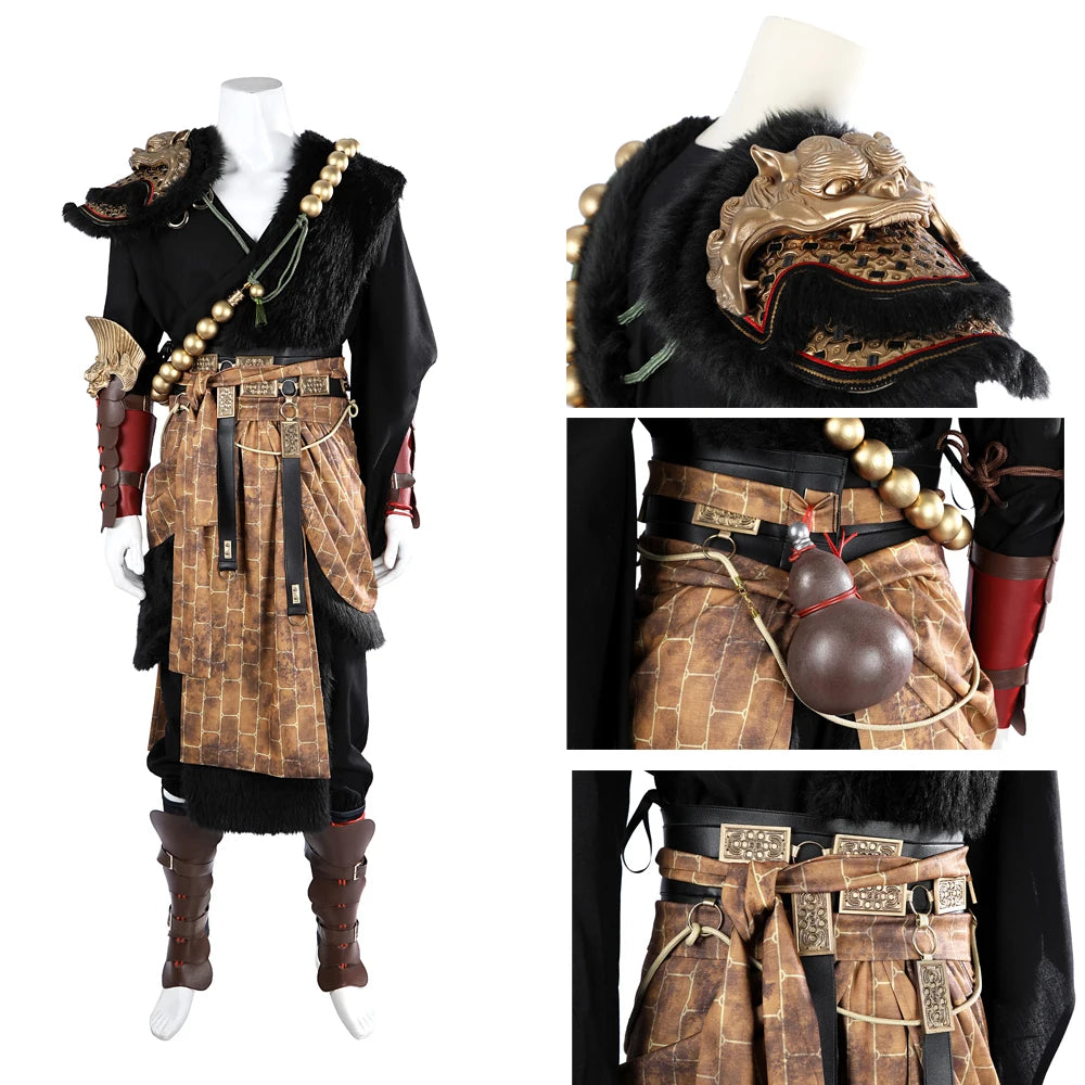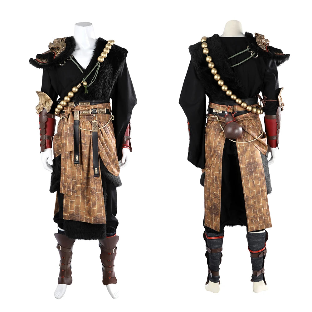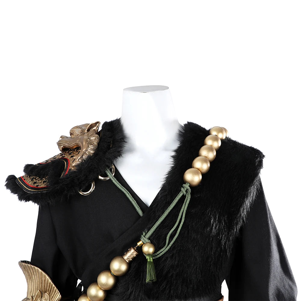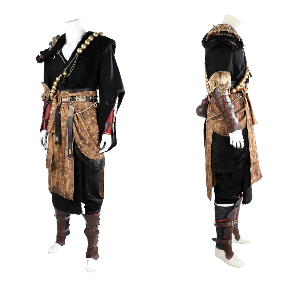 This Sun Wukong cosplay features distinctive elements such as the dragon-shaped shoulder armor, the iconic fur-lined cape, and the stylized chest and arm plates. The leather boots, belt, and pouches add practicality to the warrior’s attire, while the large beads draped across the chest embody the Monkey King’s strength and charisma. The brown and gold hues combined with the black robe bring a perfect balance of tradition and mythical power, making this cosplay not just a costume, but a piece of art.