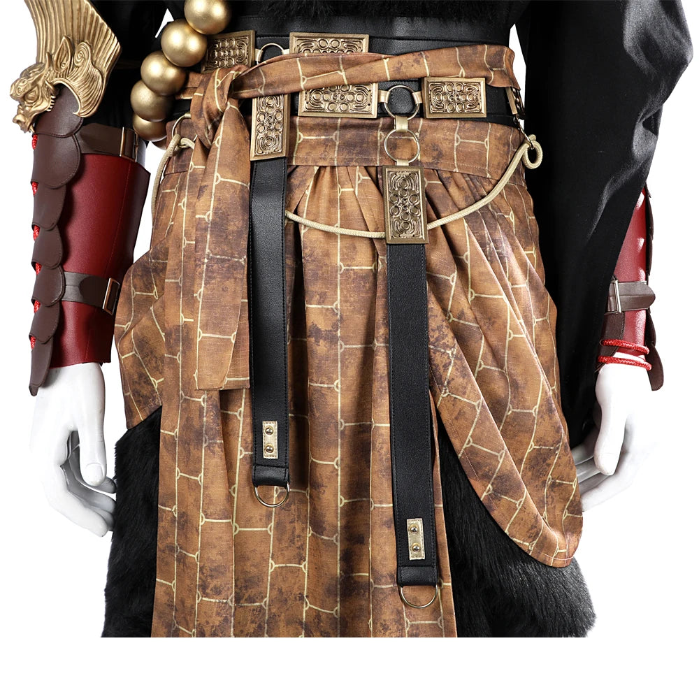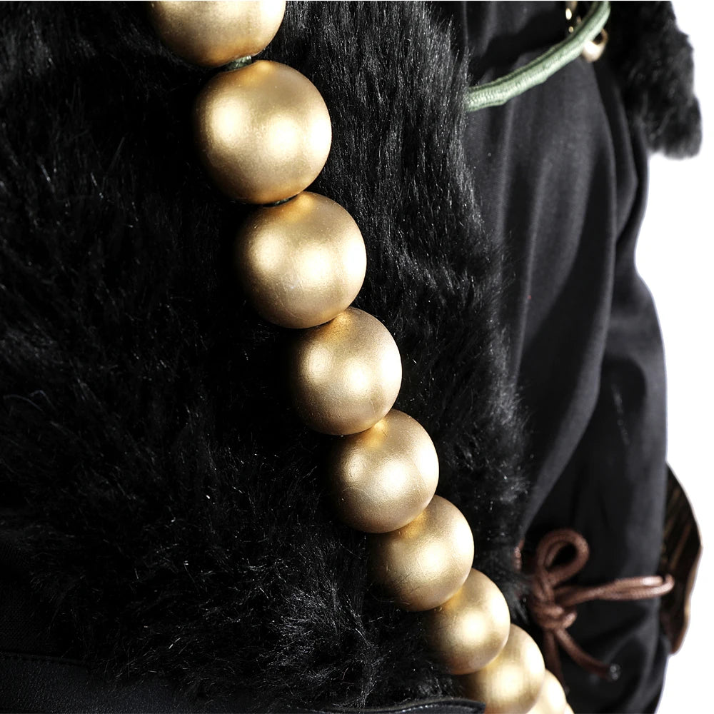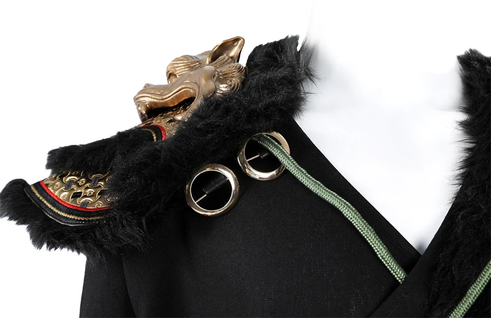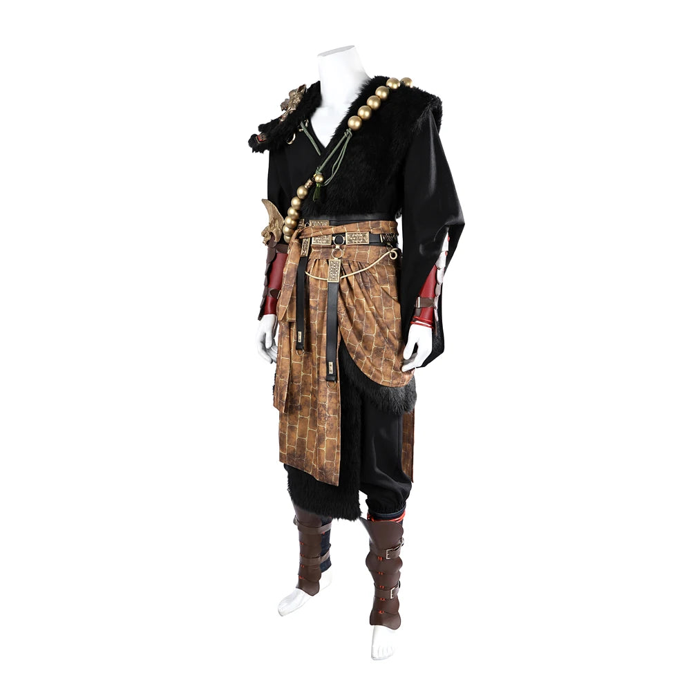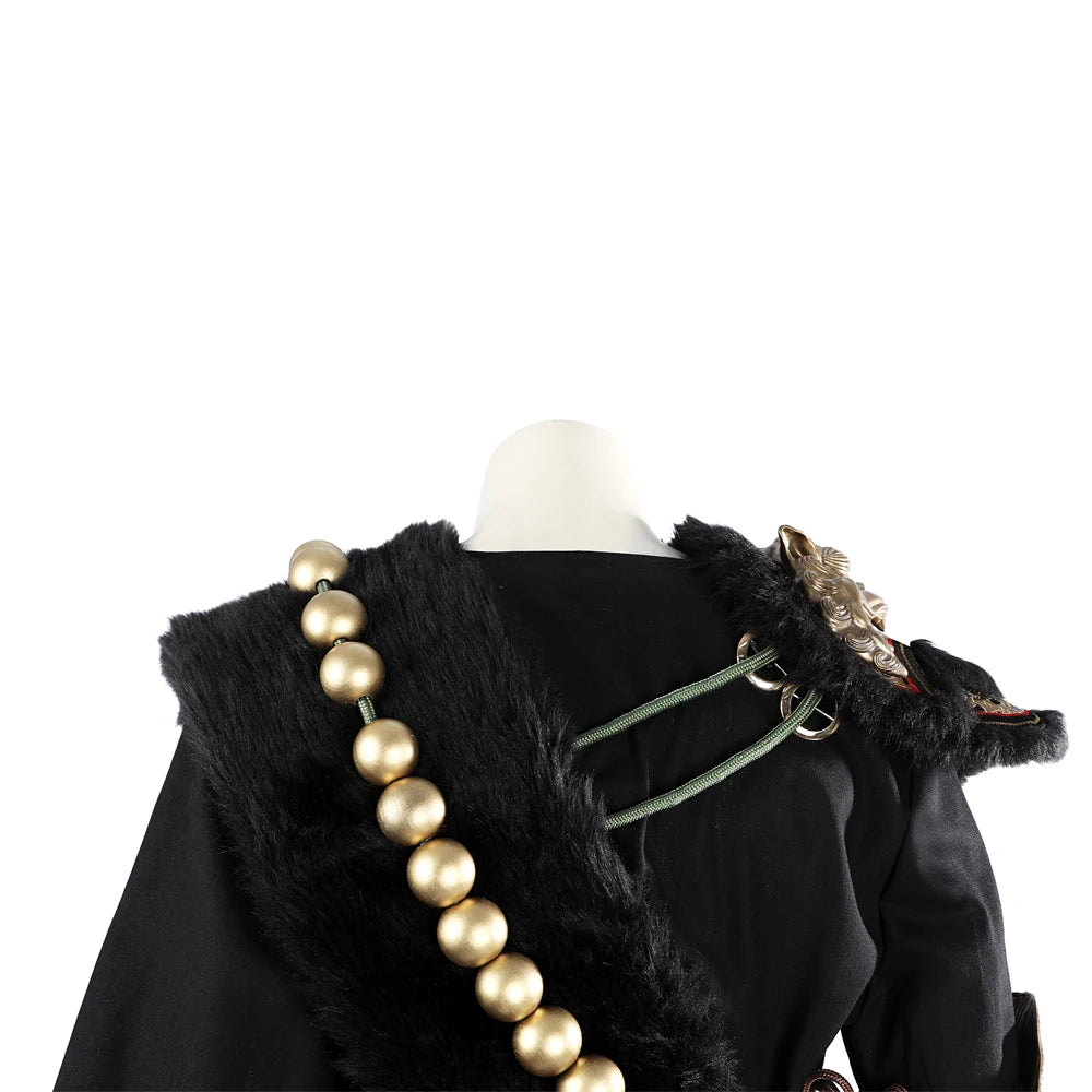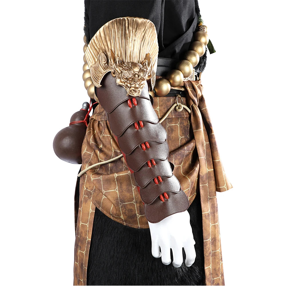This Sun Wukong cosplay features distinctive elements such as the dragon-shaped shoulder armor, the iconic fur-lined cape, and the stylized chest and arm plates. The leather boots, belt, and pouches add practicality to the warrior’s attire, while the large beads draped across the chest embody the Monkey King’s strength and charisma. The brown and gold hues combined with the black robe bring a perfect balance of tradition and mythical power, making this cosplay not just a costume, but a piece of art.