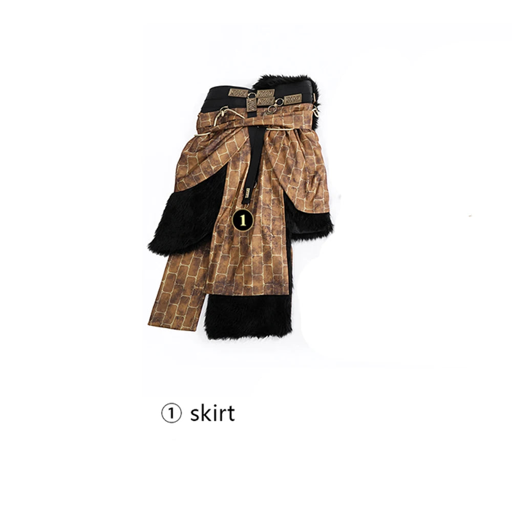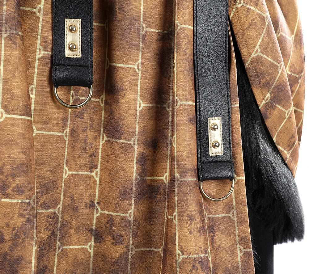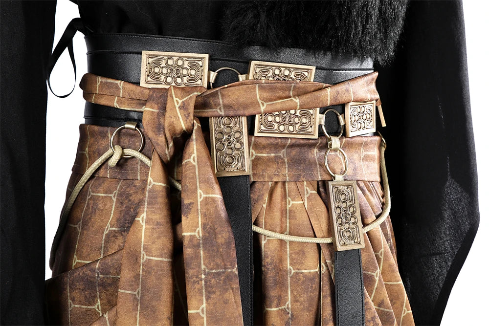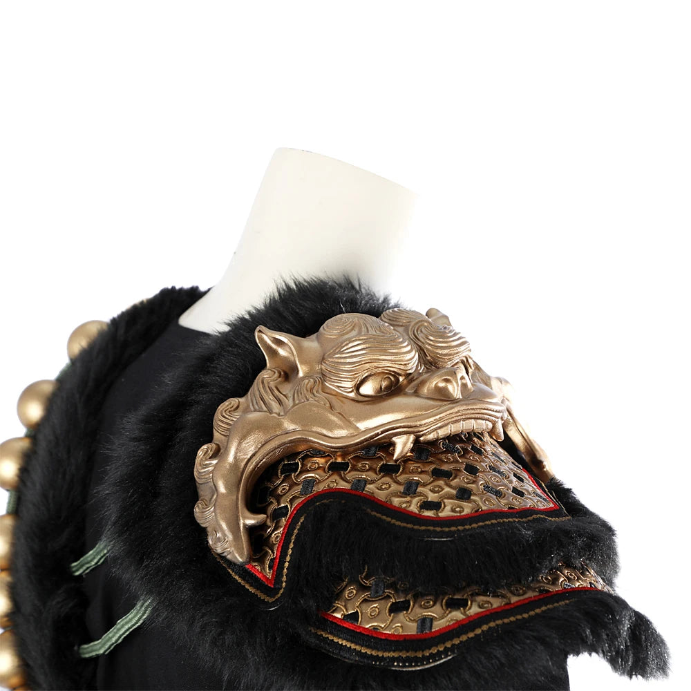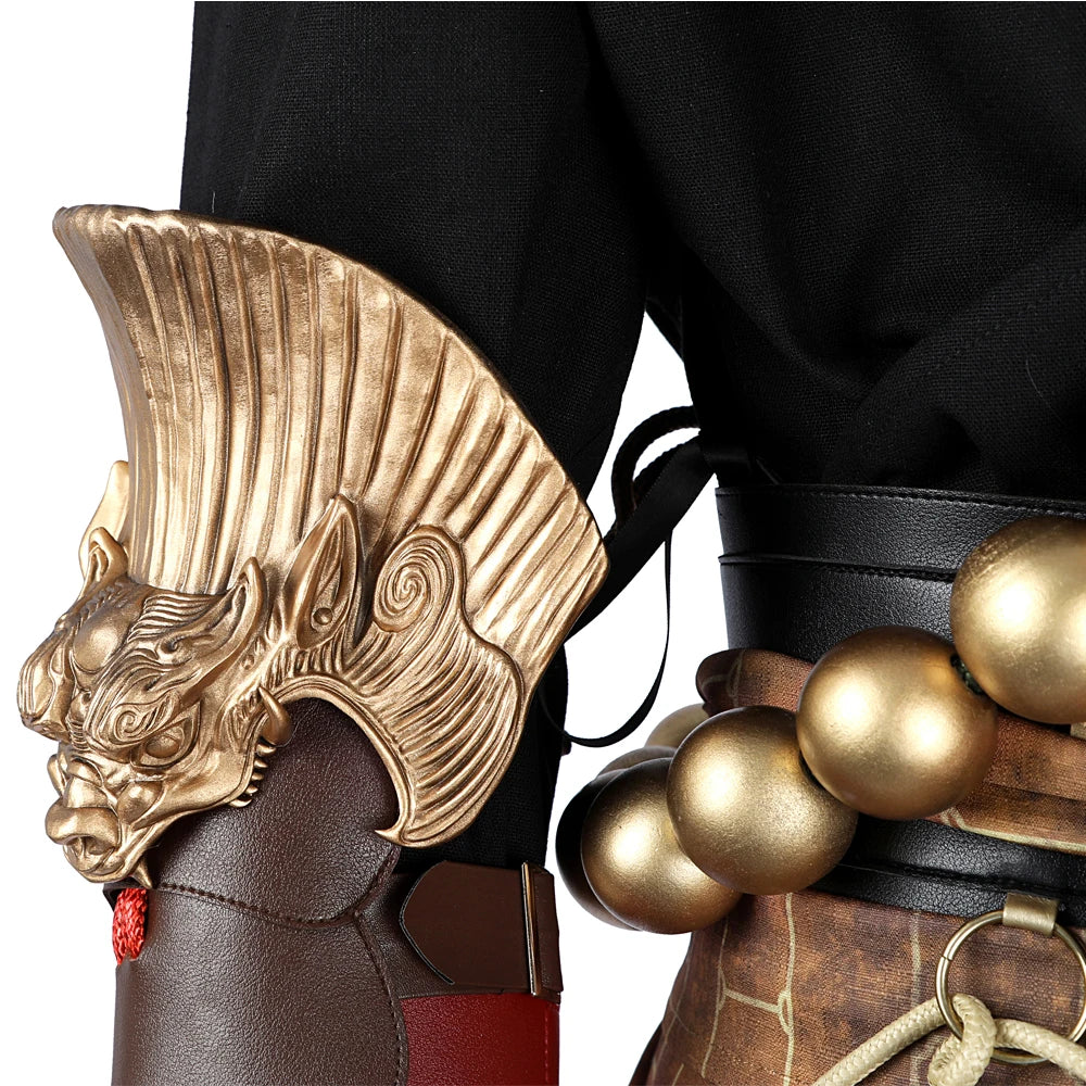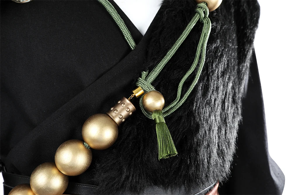 This Sun Wukong cosplay features distinctive elements such as the dragon-shaped shoulder armor, the iconic fur-lined cape, and the stylized chest and arm plates. The leather boots, belt, and pouches add practicality to the warrior’s attire, while the large beads draped across the chest embody the Monkey King’s strength and charisma. The brown and gold hues combined with the black robe bring a perfect balance of tradition and mythical power, making this cosplay not just a costume, but a piece of art.