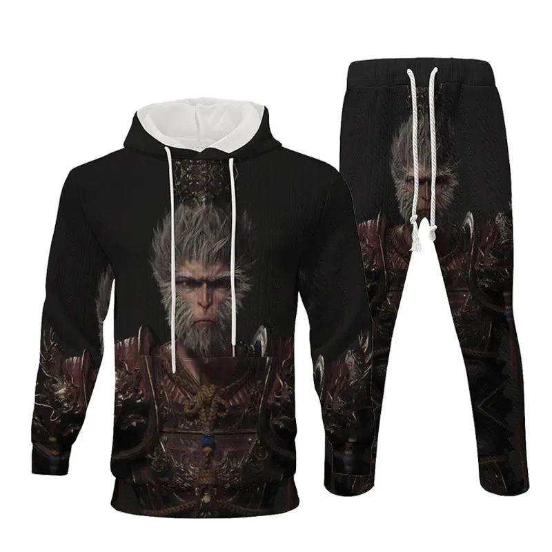 Featuring a bold and striking graphic of Black Myth: Wukong, this hoodie and pants set is perfect for fans of the game. The intricate artwork highlights the legendary character Wukong, bringing the essence of the game to life. The design is printed with vibrant colors on a sleek black background, making it a must-have piece for dedicated fans who want to represent their favorite game in style.