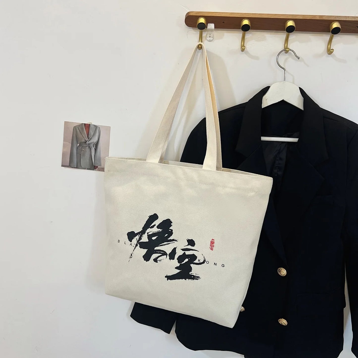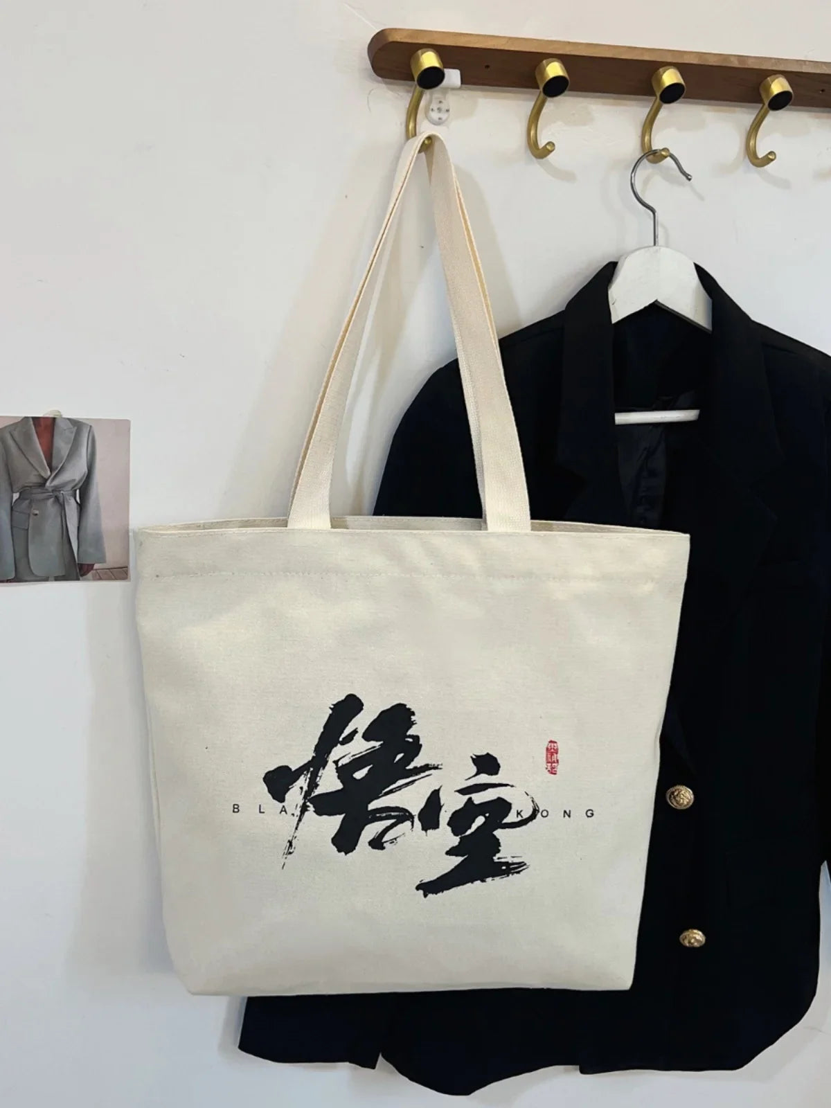 The Black Mty Hwukong white tote bag offers a fresh perspective on urban sophistication, combining a minimalist aesthetic with a touch of artistic charm. The crisp white background accentuated by bold black calligraphy and a vibrant red signature stamp creates a visually impactful contrast. This tote is perfect for those who value simplicity with a distinctive edge in their accessories.