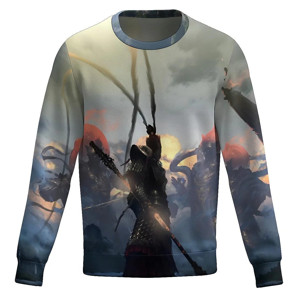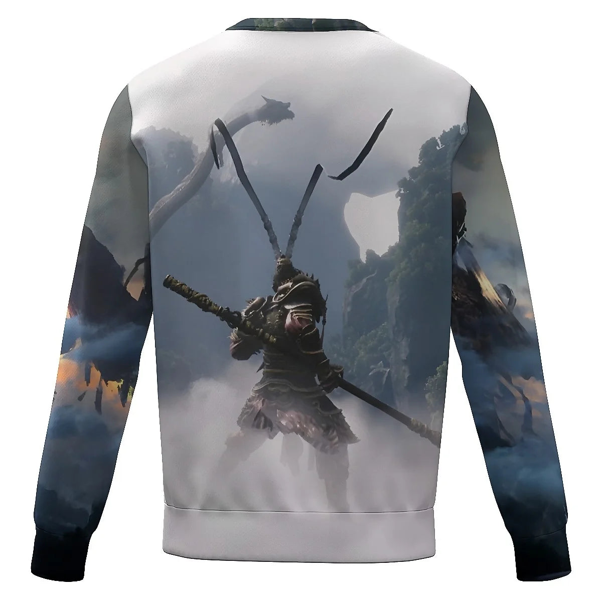 The front of the sweatshirt features a breathtaking graphic of an intense battle from Black Myth: Wukong. With its dramatic depiction of fierce warriors and the powerful red sun setting in the background, this sweatshirt captures the game’s epic visual style. It’s the perfect way to showcase your love for the game in an artistic and bold way.