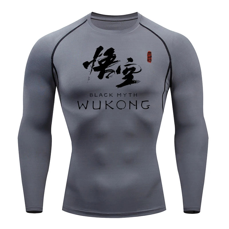 Train like a legend with the Black Myth: Wukong gray compression t-shirt. This long-sleeve shirt provides optimal muscle support, reducing fatigue and helping you recover faster after intense sessions. The compression fit enhances circulation, allowing you to push your limits during workouts or gaming marathons.