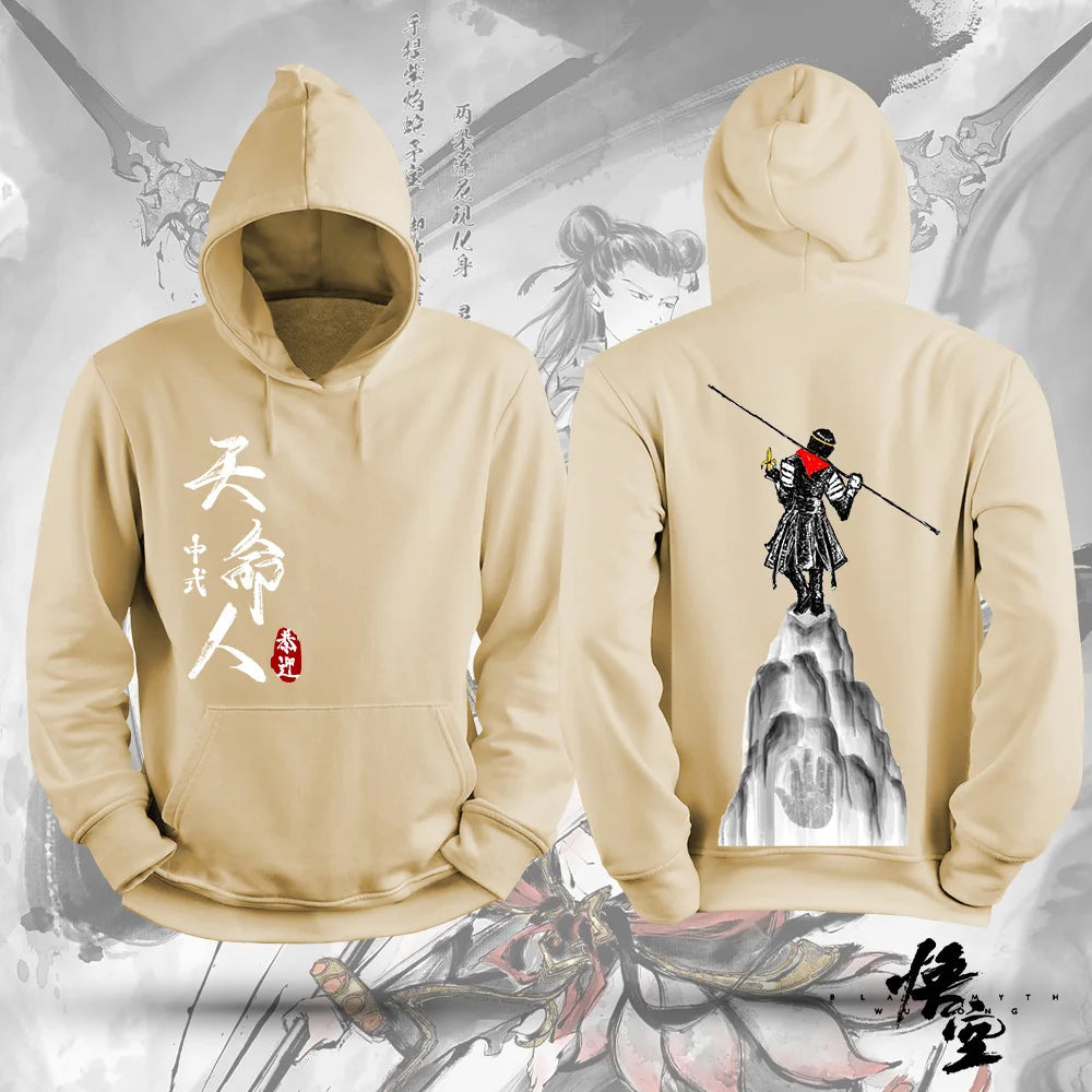 Step into the legend of Sun Wukong with this sophisticated beige Black Myth Wukong hoodie, featuring intricate Chinese calligraphy on the front and a powerful depiction of the Monkey King standing atop a mountain with his legendary staff on the back.