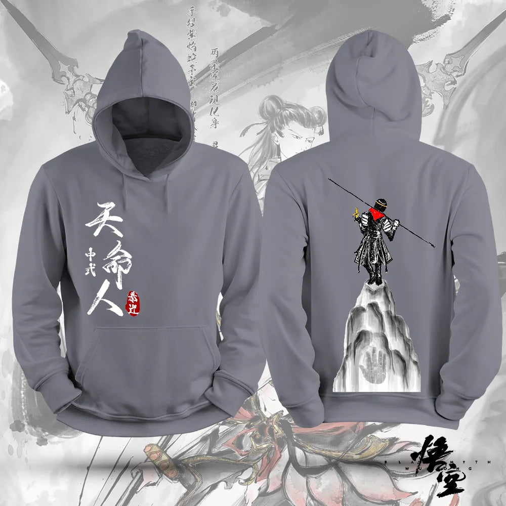 Step into the world of Black Myth Wukong with this elegant dark gray hoodie, featuring intricate Chinese calligraphy on the front and a bold depiction of Sun Wukong standing atop a mountain with his mystical staff on the back.