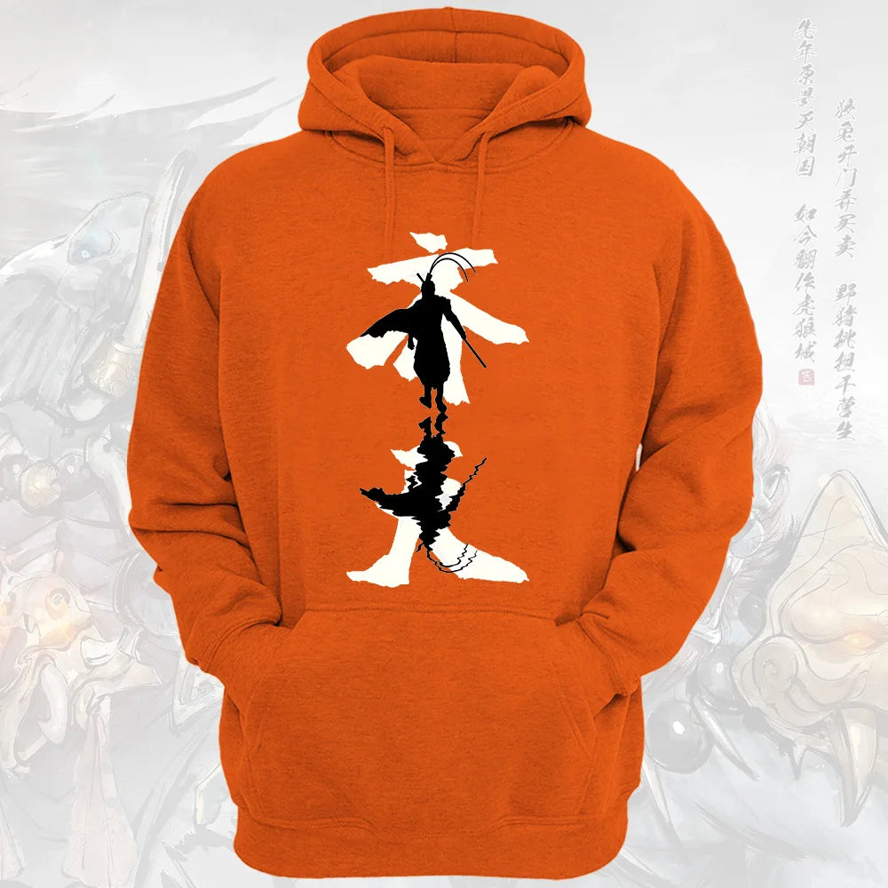Unleash the fiery spirit of Sun Wukong with this vibrant orange Black Myth Wukong hoodie, inspired by the epic saga of the Monkey King. Featuring a bold silhouette design, this hoodie is perfect for fans of the game and Chinese mythology.