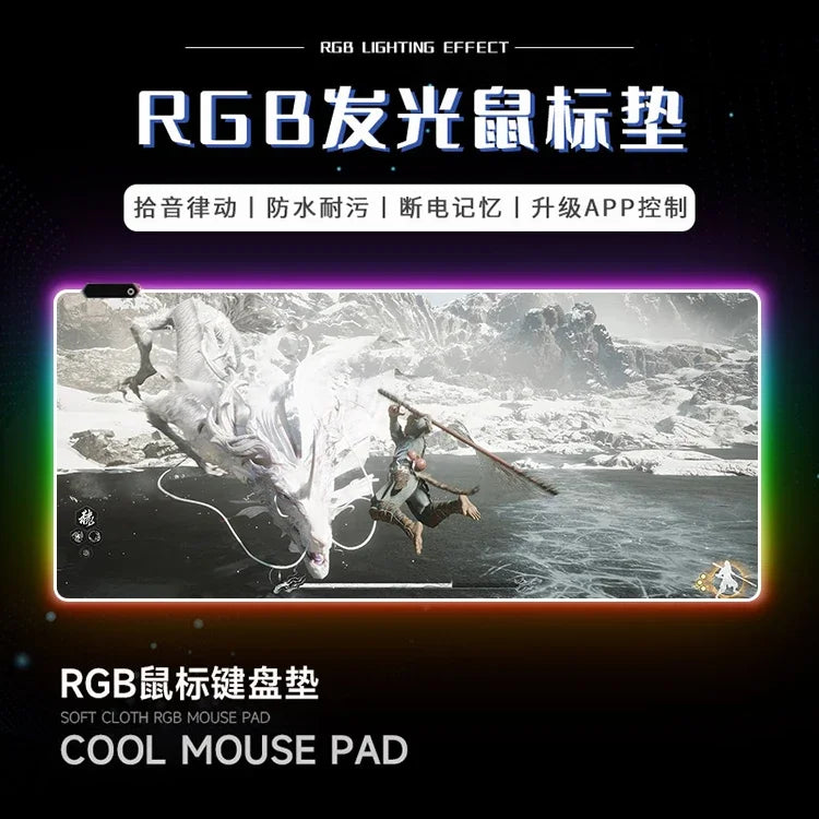 Celebrate your passion for Black Myth: Wukong with these high-quality RGB mouse pads, featuring iconic game elements such as the Ruyi Jingu Bang and epic battle scenes with mythical creatures like the White Dragon. The luminous border adds a touch of sophistication to your setup, making it the perfect accessory for any gaming enthusiast. Whether you're a casual player or a dedicated fan, these mouse pads are designed to enhance your desk and showcase your love for the epic saga of the Monkey King.
