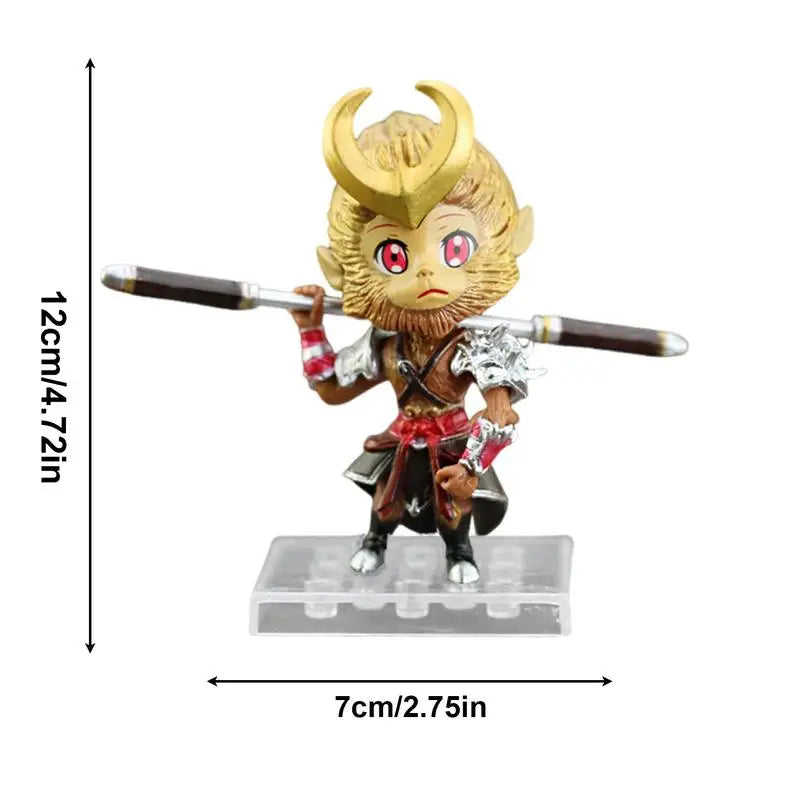 Made from premium PVC, this Sun Wukong figurine showcases impressive details, from intricate armor plating to his dual staff weapons, ready for battle. Measuring 12 cm (4.72 in) in height and 7 cm (2.75 in) in width, this figure is compact yet highly detailed, making it an eye-catching addition to any collection.
