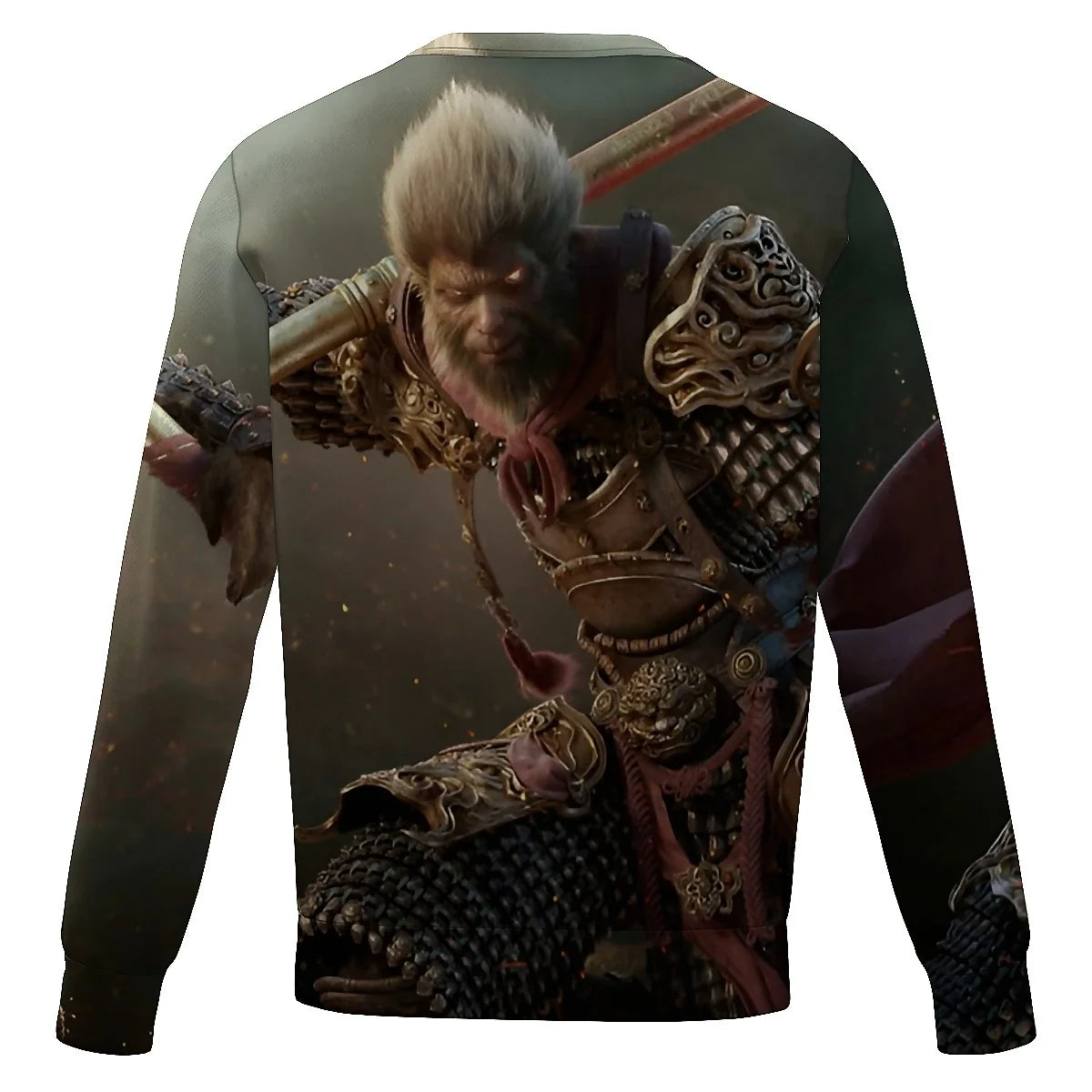 The front of this sweatshirt features a stunning graphic of Wukong in full combat mode, armed and ready for battle. The dynamic action scene is beautifully designed, capturing the strength and power of the character as he takes on his enemies. The vivid details of Wukong's armor and intense expression make this a standout piece for any fan of Black Myth: Wukong.