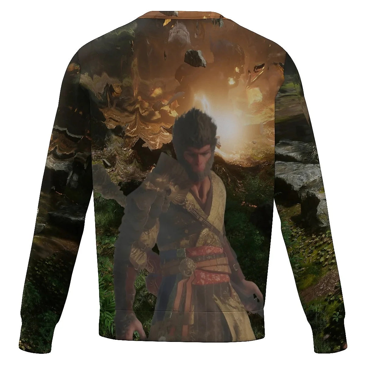 The sweatshirt features a breathtaking design of Wukong, captured in an epic battle scene from the game. The vivid colors and dynamic portrayal of Wukong bring the action and intensity of Black Myth: Wukong to life. With the incredible background of powerful, crumbling terrain, this sweatshirt stands as a bold representation of the game’s adventurous spirit.