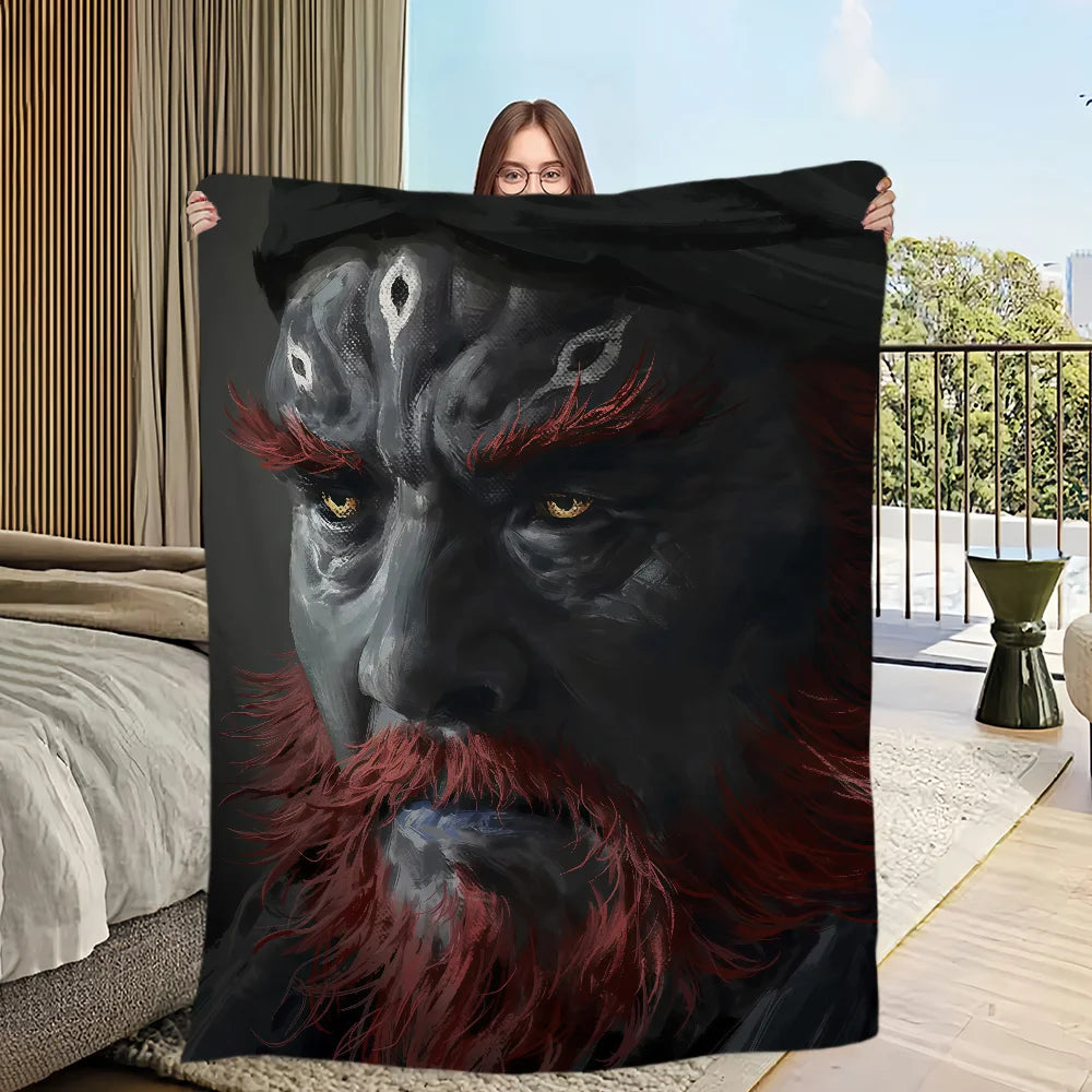 The blanket showcases a close-up artwork of Zhong Kui’s face, highlighting his fiery red beard, piercing golden eyes, and mystical forehead markings. Inspired directly by Black Myth: Wukong, this design captures the Demon Slayer’s fierce determination and unmatched power.