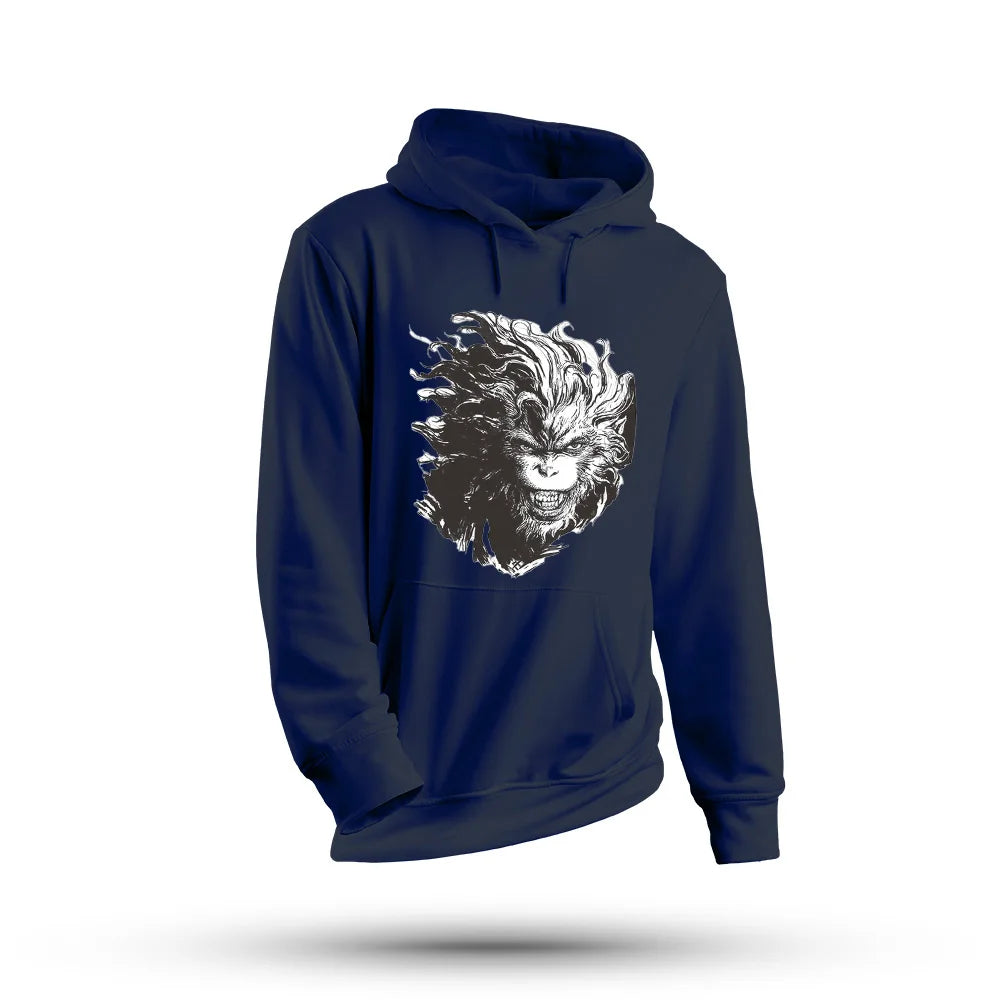 Step into the world of Black Myth: Wukong with this Fierce Wukong Navy Blue Hoodie. Designed for fans who embrace the spirit of the legendary Monkey King, this hoodie features an eye-catching black and white Wukong design, set against a deep navy blue background, combining elegance and boldness.