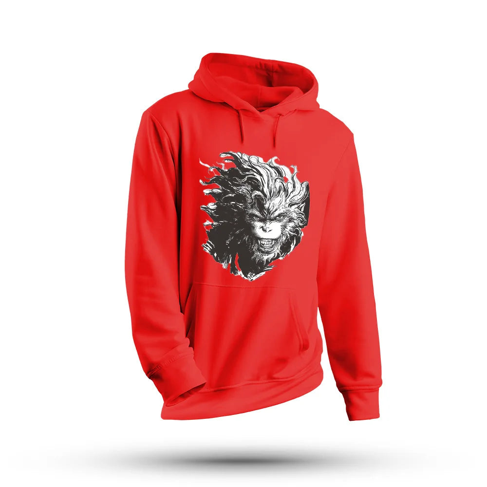 Step into the world of Black Myth: Wukong with this Fierce Wukong Red Hoodie. Designed for fans who embrace the spirit of the legendary Monkey King, this hoodie features an eye-catching black and white Wukong design, set against a bold red background, making a powerful statement.