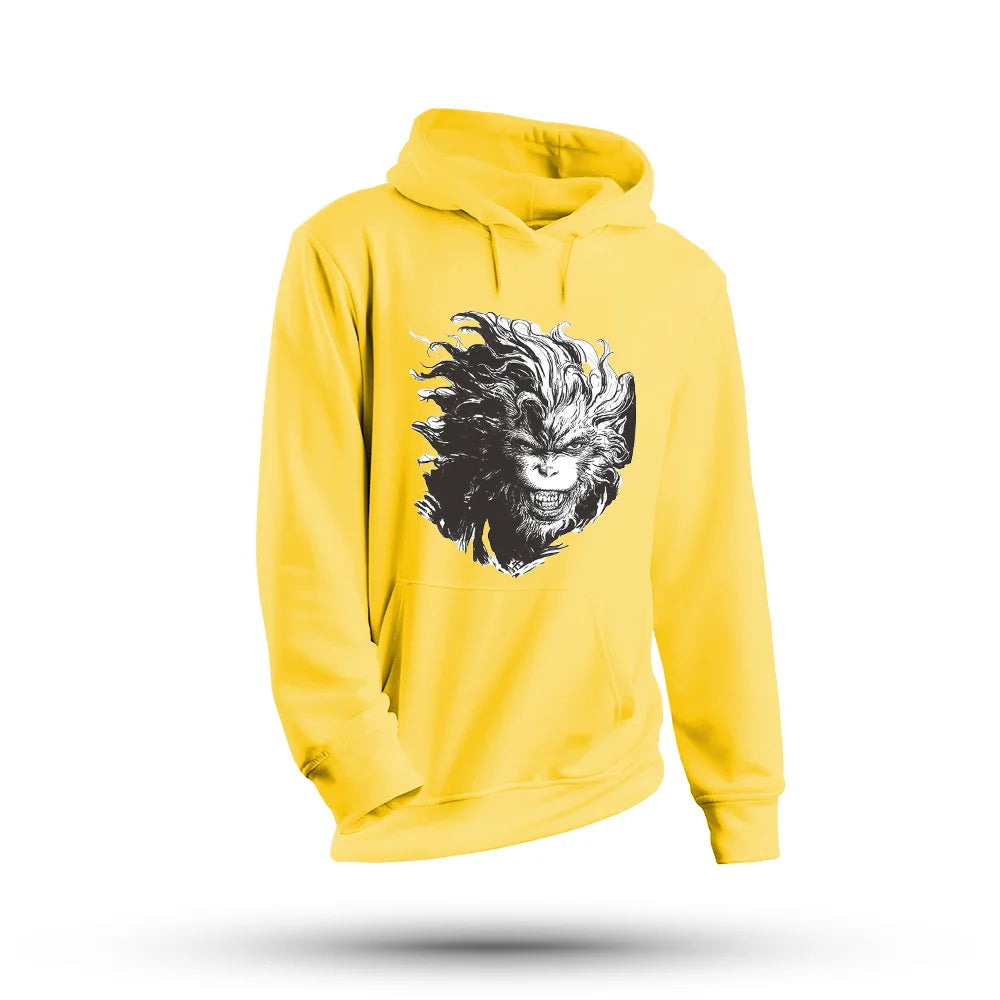 Step into the world of Black Myth: Wukong with this Fierce Wukong Yellow Hoodie. Designed for fans who embrace the spirit of the legendary Monkey King, this hoodie features an eye-catching black and white Wukong design, set against a vibrant yellow background.