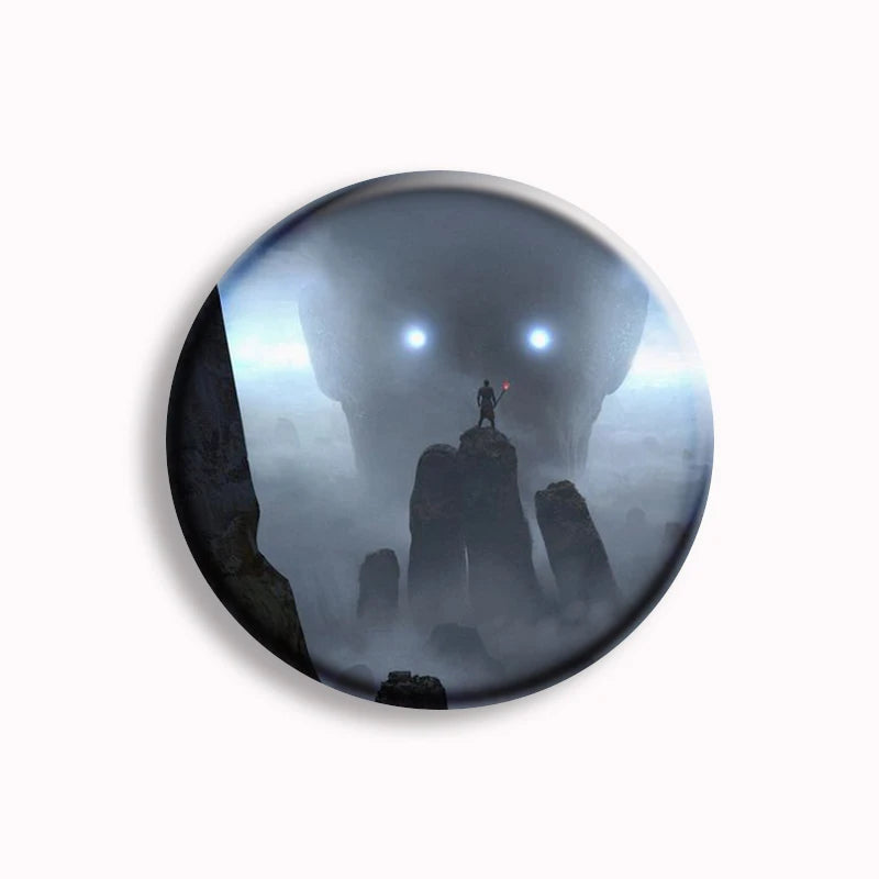 Introducing the Mysterious Giant Pin from Black Myth: Wukong, capturing a moment of profound mystery and suspense. This pin features the silhouette of a lone figure standing before an enormous, glowing-eyed giant, set against a misty and ethereal backdrop. The image evokes the thrilling encounters and epic scale that fans of the game love.