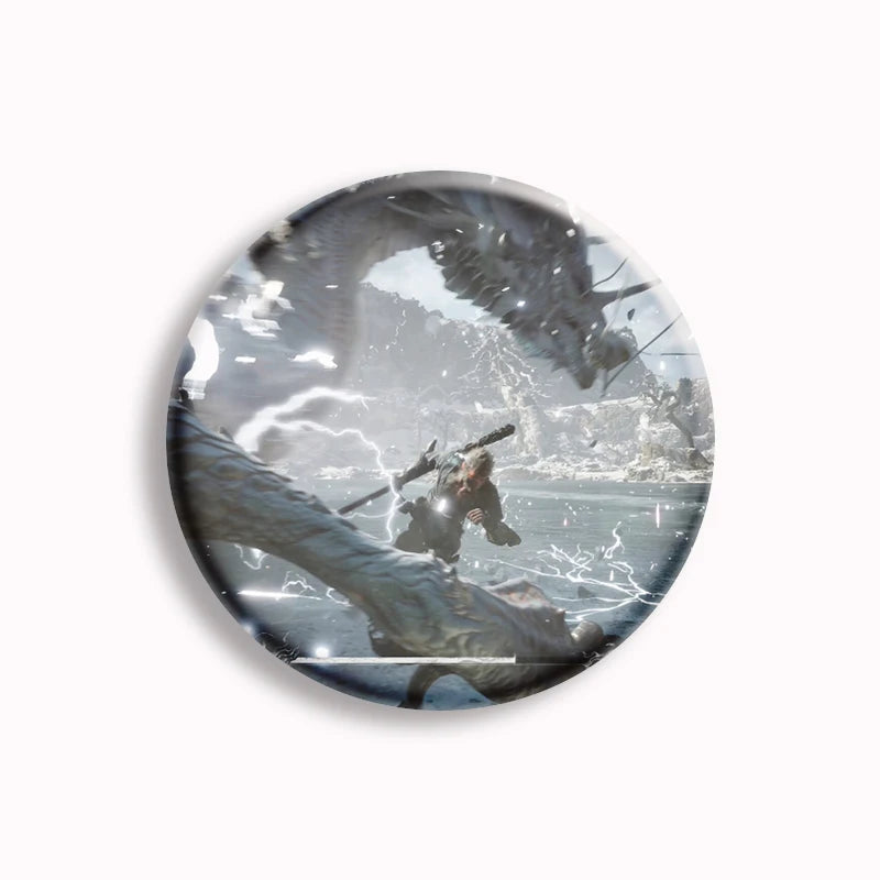 Introducing the Epic Battle with the Dragon Pin, a stunning depiction of one of the most intense moments from Black Myth: Wukong. This pin captures the breathtaking clash between Sun Wukong and the formidable dragon, showcasing the game's legendary battles and stunning visuals.