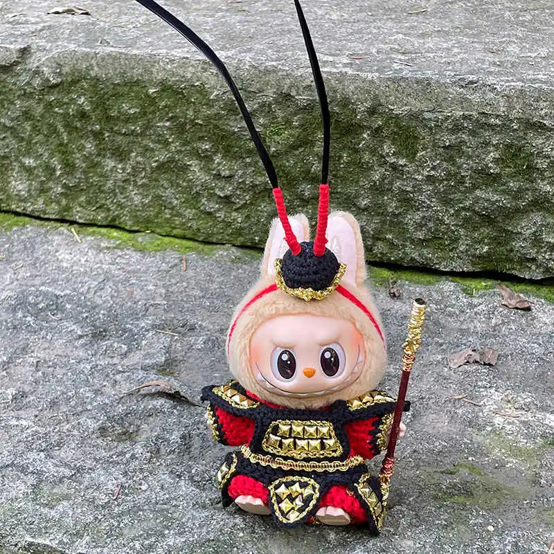 This 17cm collector's plush features Labubu in detailed, hand-sewn armor with a soft fur hood, rabbit ears, and an epic expression full of energy. The metallic embroidery and miniature Ruyi Jingu Bang (golden staff) add authenticity and collectible value.