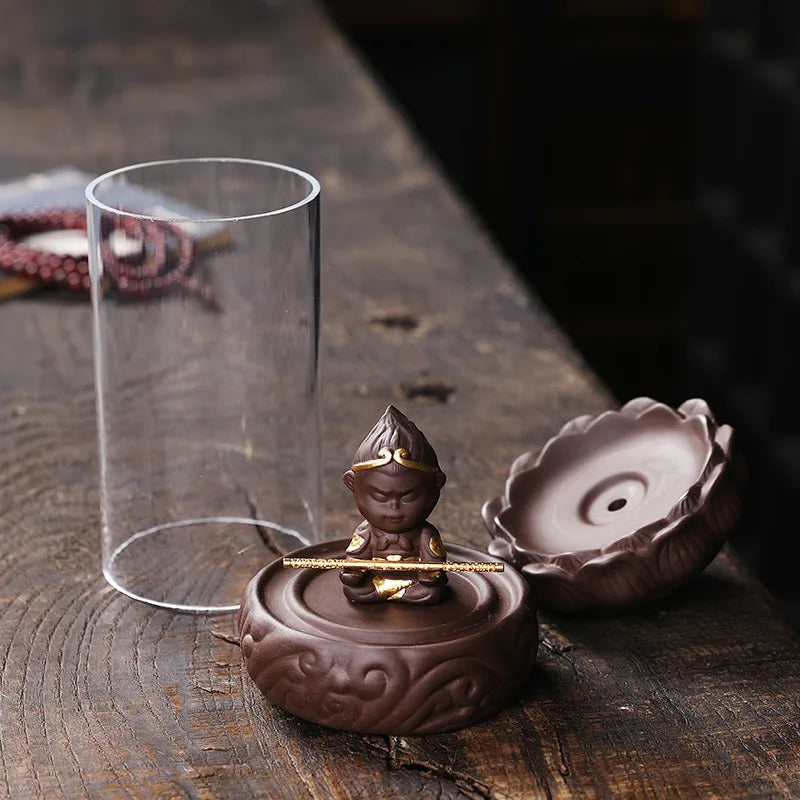 This incense burner features a miniature figurine of the Monkey King in a meditative pose, surrounded by intricate details that highlight the essence of Black Myth: Wukong. The smoke flows down from the lotus flower at the top, symbolizing enlightenment and serenity. With its elegant and artistic design, this burner doubles as a decorative piece for your home or office.