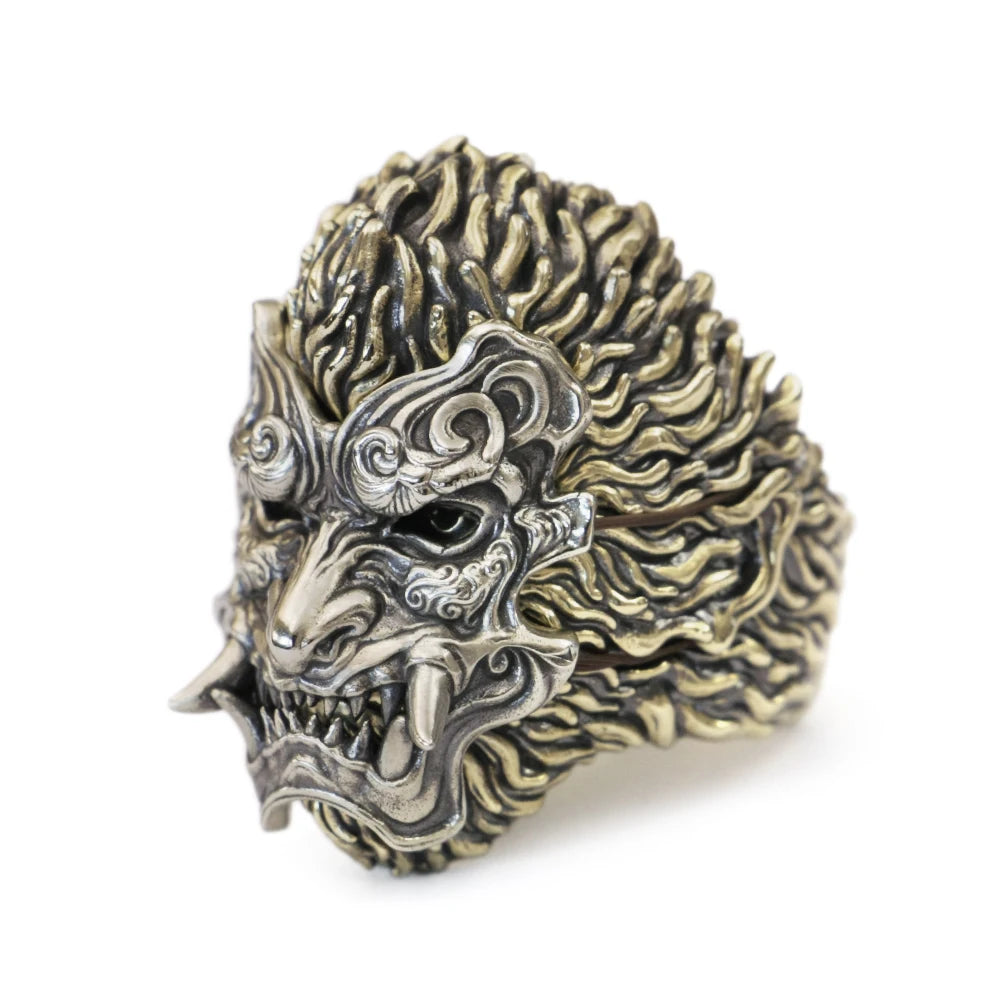 Meticulously crafted with antique silver and gold-toned accents, this ring showcases intricate patterns reminiscent of ancient Eastern armor and divine beast motifs. The snarling mask, flowing mane, and sharp fangs give it a powerful and intimidating aesthetic — perfect for fans of dark fantasy and warrior symbolism.
