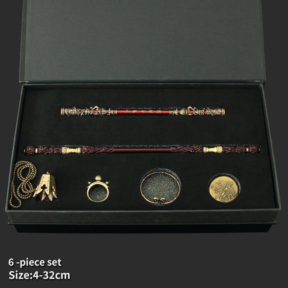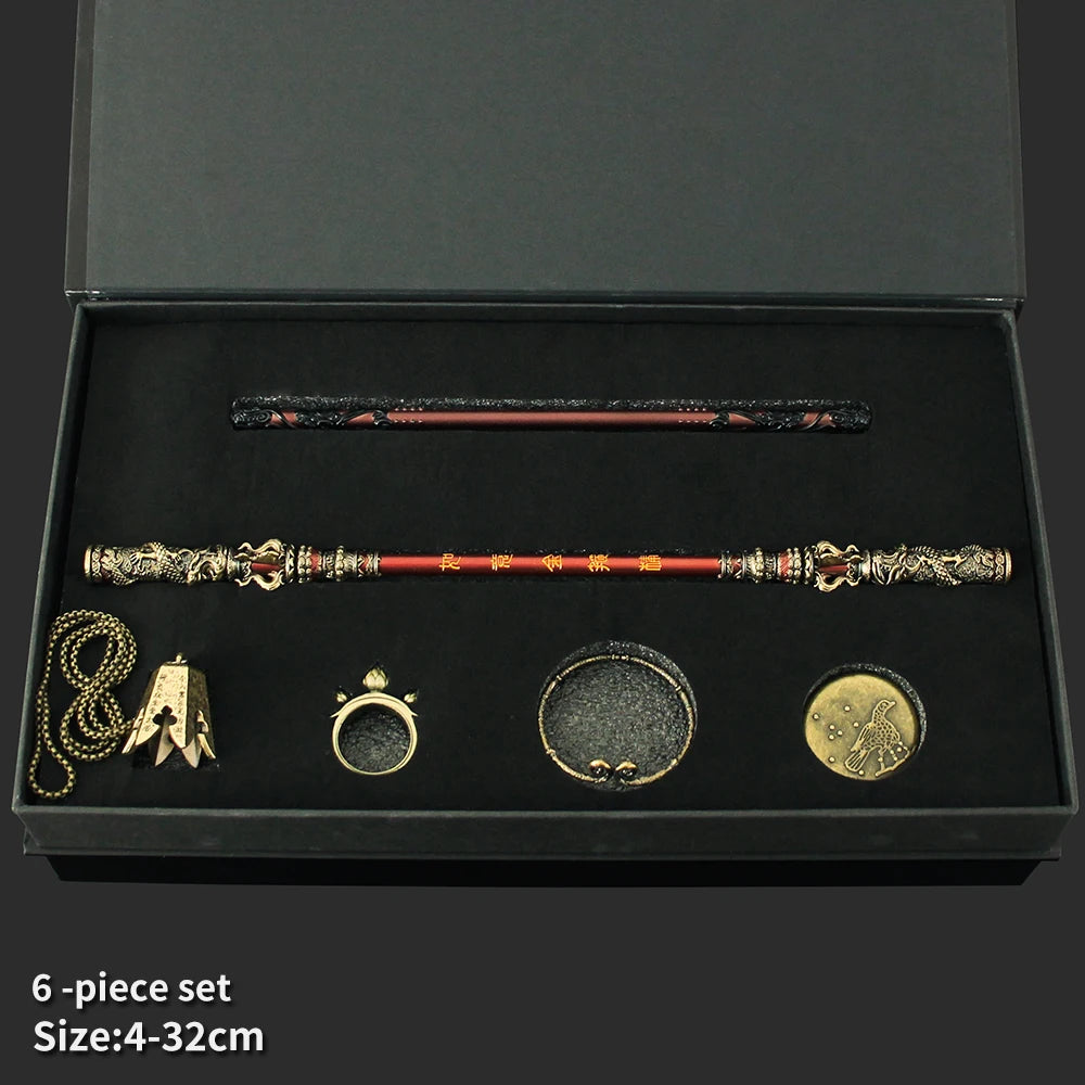 Accompanying the staffs, this set includes a selection of traditional Chinese jewelry pieces, each bearing symbolic motifs linked to Sun Wukong. The collection features a ring, a necklace, earrings, and a decorative coin, all crafted with meticulous attention to detail. These pieces not only complement the staffs but also offer fans a wearable reminder of Sun Wukong’s wisdom and mischievous spirit.